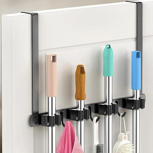 Broom Holder Over The Door – 304 Stainless Steel Mop and Broom Holder Wall Mounted or Hanging Over The Door with Hooks – Broom Hanger, Broom Storage Tool Organizer for Garage Closet Laundry