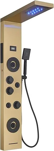 Brushed Gold Shower Panel LED Rainfall Shower Head, Bathroom Shower Panel Tower System Body Massage 6-Functions Temperature Display Wall Mount, Gold