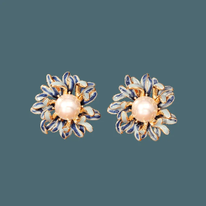 Vintage Blue White Floral Earrings Hand-Painted Enamel Drops Baroque Style Jewelry Gold Plated Hypoallergenic