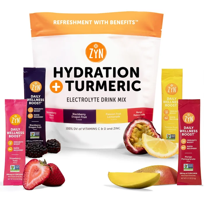 ZYN Electrolytes Powder Hydration Packets with Vitamins, Zinc & Turmeric Curcumin for Gut Health, Immune Support, Recovery, Low Sugar Packets with Piperine, Variety, 32 Pack